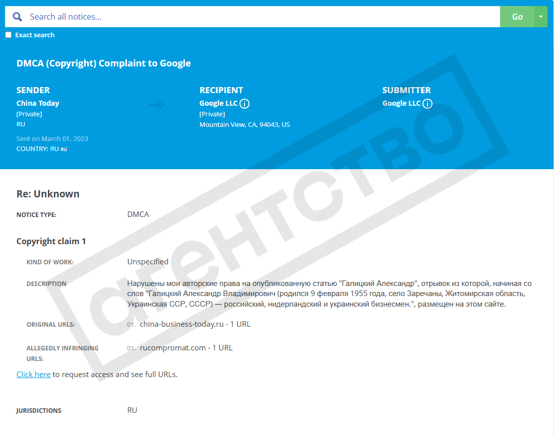Детали. Из поисковой выдачи Google пытались удалить ссылки на профиль Галицкого на сайте Rucompromat, свидетельствуют данные сервиса Lumen, агрегирующего жалобы на интернет-площадки. Согласно данным сервиса, жалобы на страницу были поданы от имени неких ИА «Роснадзор» и China Today.