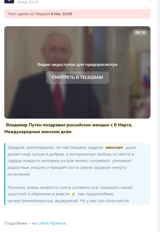 Детали. Видео хронометражем 6 минут 19 секунд было опубликовано в телеграм-канале Кремля в 01:01, а в 01:05 было удалено, свидетельствуют данные сервиса TGStat. В 1:23 было опубликован отредактированный ролик хронометражем 2 минуты 52 секунды. Первоначальный пост также репостнул, а затем удалил телеграм-канал Минобороны. Кроме того, неотредактированное видео еще до телеграм-канала Кремля (в 0:20) публиковала Readovka, однако в 0:44 издание его удалило.