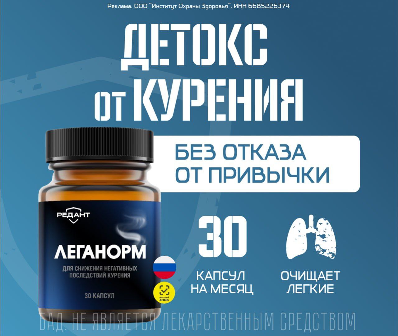 - ️Рекламировались два вида добавок — «витамины» «Штурм» и «детокс от курения» «Леганорм». Если верить рекламе, «витамины» «Штурм» «дают +12 часов энергии без откатов», «делают нервы стальными», «возвращают желание обладать и побеждать». А добавка «Леганорм» обещает за месяц «очистить легкие» курильщика «без отказа от привычки».