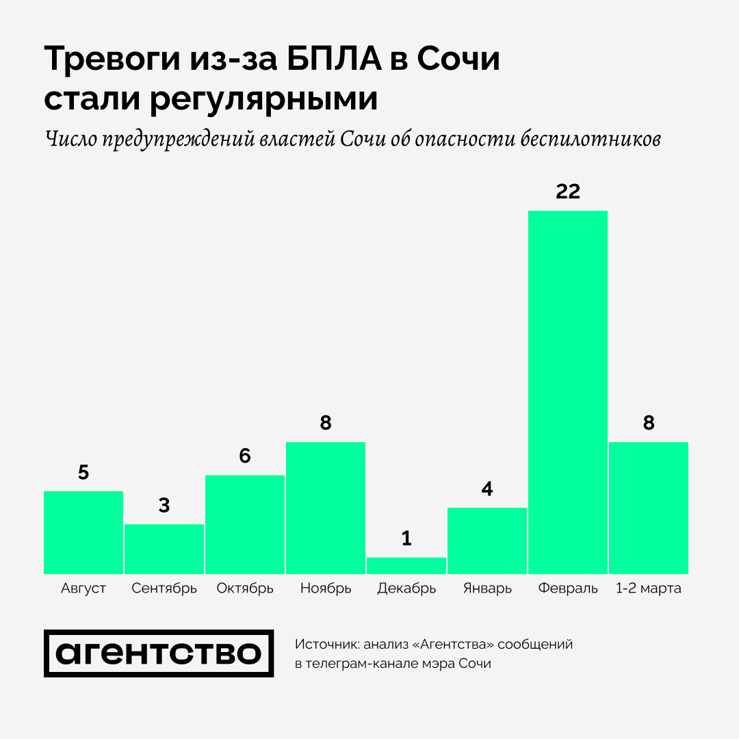 Начиная с середины февраля по 2 марта власти Сочи не менее 30 раз распространяли предупреждение о беспилотной опасности, которая требует, чтобы граждане спускались в подвалы или укрывались в комнатах без окон. Это больше, чем за все время до февраля, свидетельствует анализ «Агентства». Суммарно режим беспилотной опасности в городе действовал 45 часов за последние 20 дней.